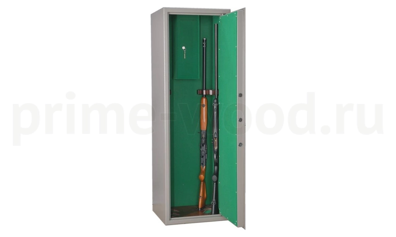 Сейф односекционный, на 6 стволов оснащен съемными полками и отделением под патроны. Внутренняя поверхность сейфа покрывается флоком. Ложементы — дерево. Максимальная высота устанавливаемого оружия — 1380 мм. В двери установлены 2 ключевых 8-ми сувальдных замка с ригельной системой запирания в 3 стороны. Диаметр ригеля 20 мм.