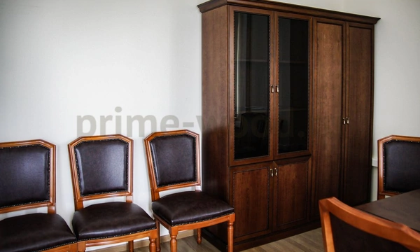 После обсуждения нюансов заказа с менеджером Prime Wood выбор остановили на мебели итальянского производства из коллекции "Conte". Массивный письменный стол со вставкой из натуральной кожи на столешнице выполнен из шпонированной МДФ и массива дерева. Брифинг-приставка, креденция и вместительный шкаф из двух секций - со стеклом и с глухими дверьми - дополняют композицию. Шесть деревянных стульев "Версаль" в классическом стиле в натуральной коже с использованием эффектных декоративных обивочных гвоздей придают интерьеру завершённый вид. Кабинет выглядит респектабельно, роскошь натуральной древесины подчёркивают его значительность.